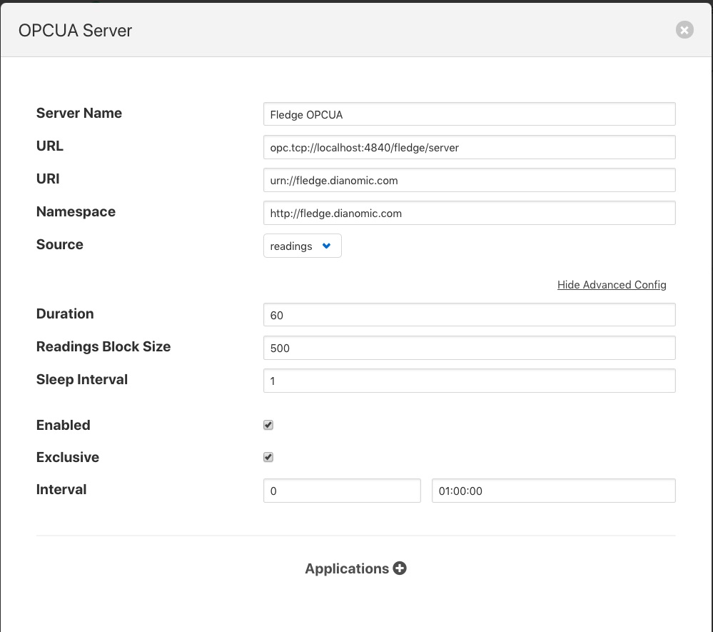 The Duration option controls how long the north task will run before stopping. Each time it stops any client connected to the FogLAMP OPC UA server will be disconnected. In order to reduce the disconnect/reconnect volumes, it is advisable to set this to a value greater than the 60 second default. In our example here we set the repeat interval to one hour, so ideally we should set the duration to an hour also such that there is no time when an OPC UA server is not running. Duration is set in seconds, so should be 3600 in our example.