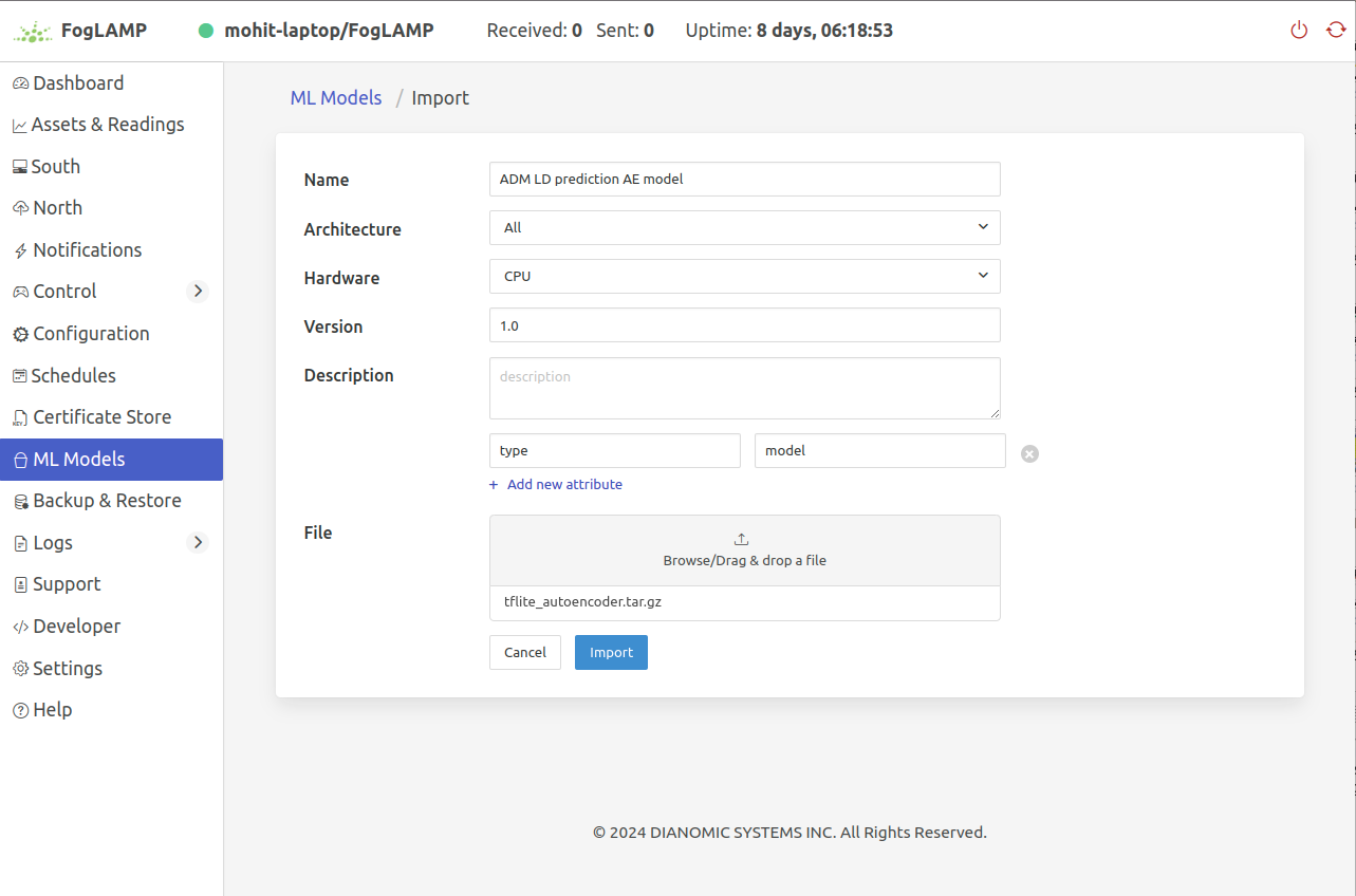 Click on import, and set the appropriate values. Additionally, add an attribute “type” with value “model”. Then upload the compressed file prepared above. e.g.